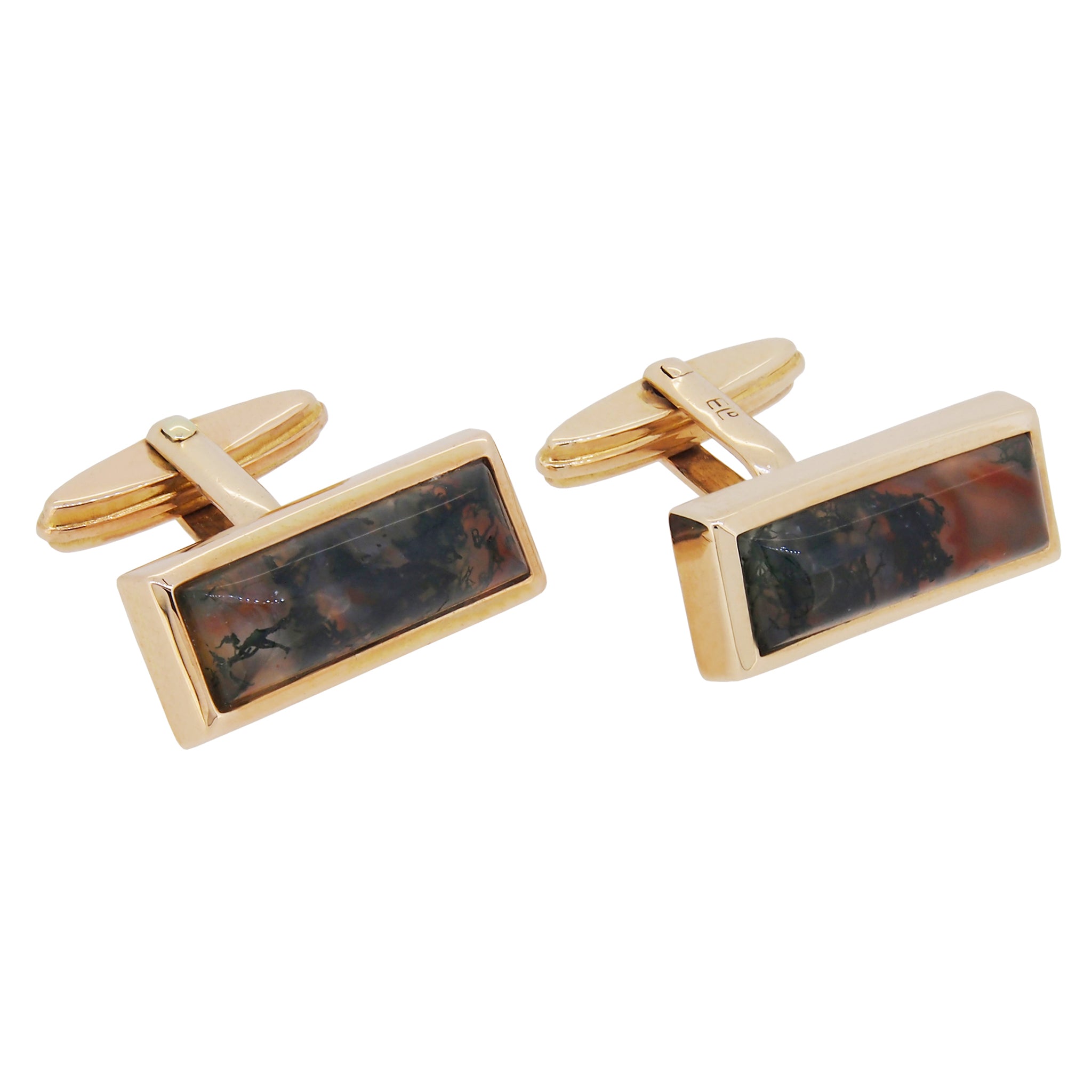 A pair of mid-20th century, 9ct yellow gold, moss agate set, rectangular, toggle link cufflinks.