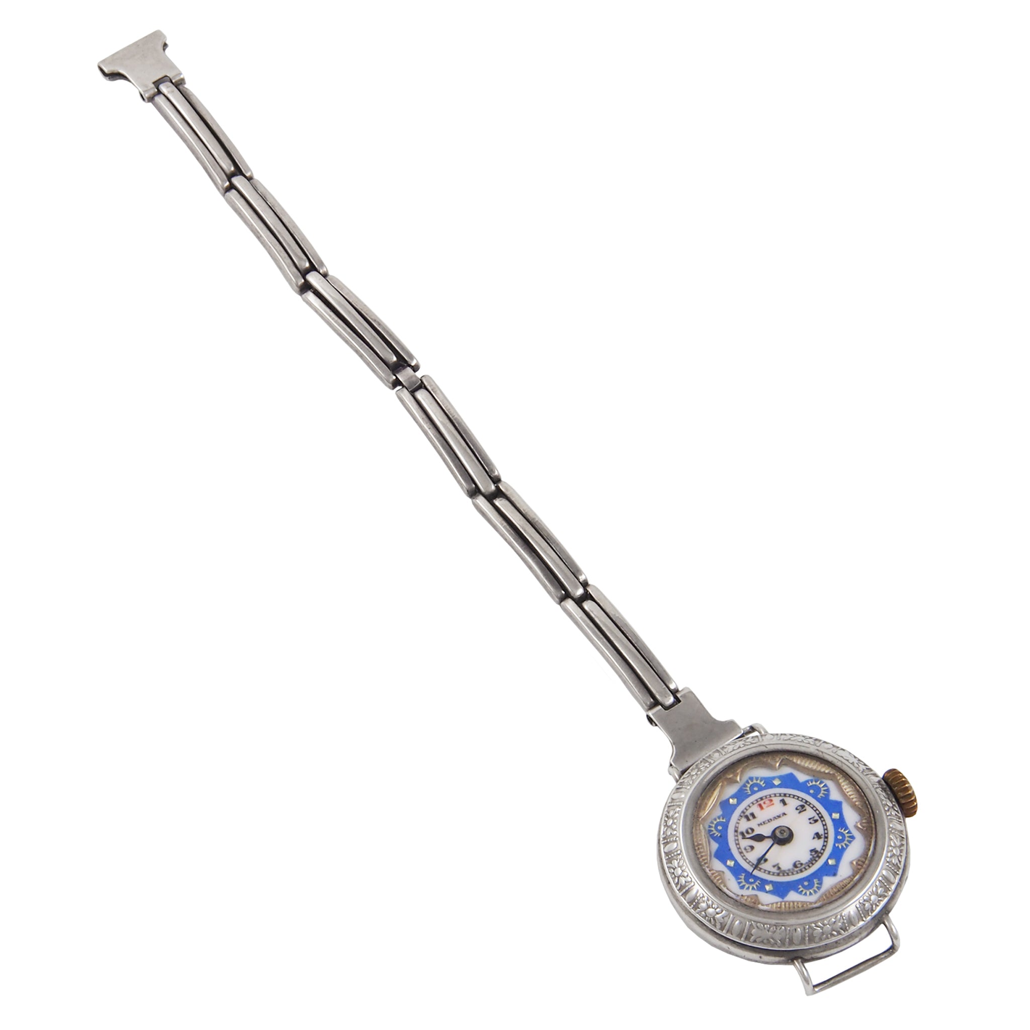 An early 20th century, silver wristlet watch on an elasticated strap.