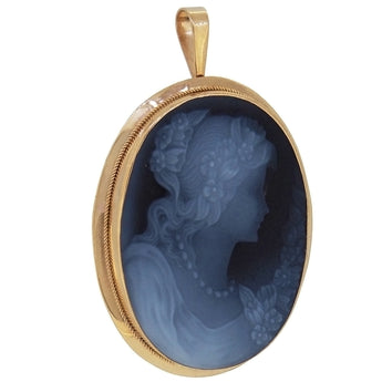 A modern, 9ct yellow gold, hardstone cameo set pendant brooch.
