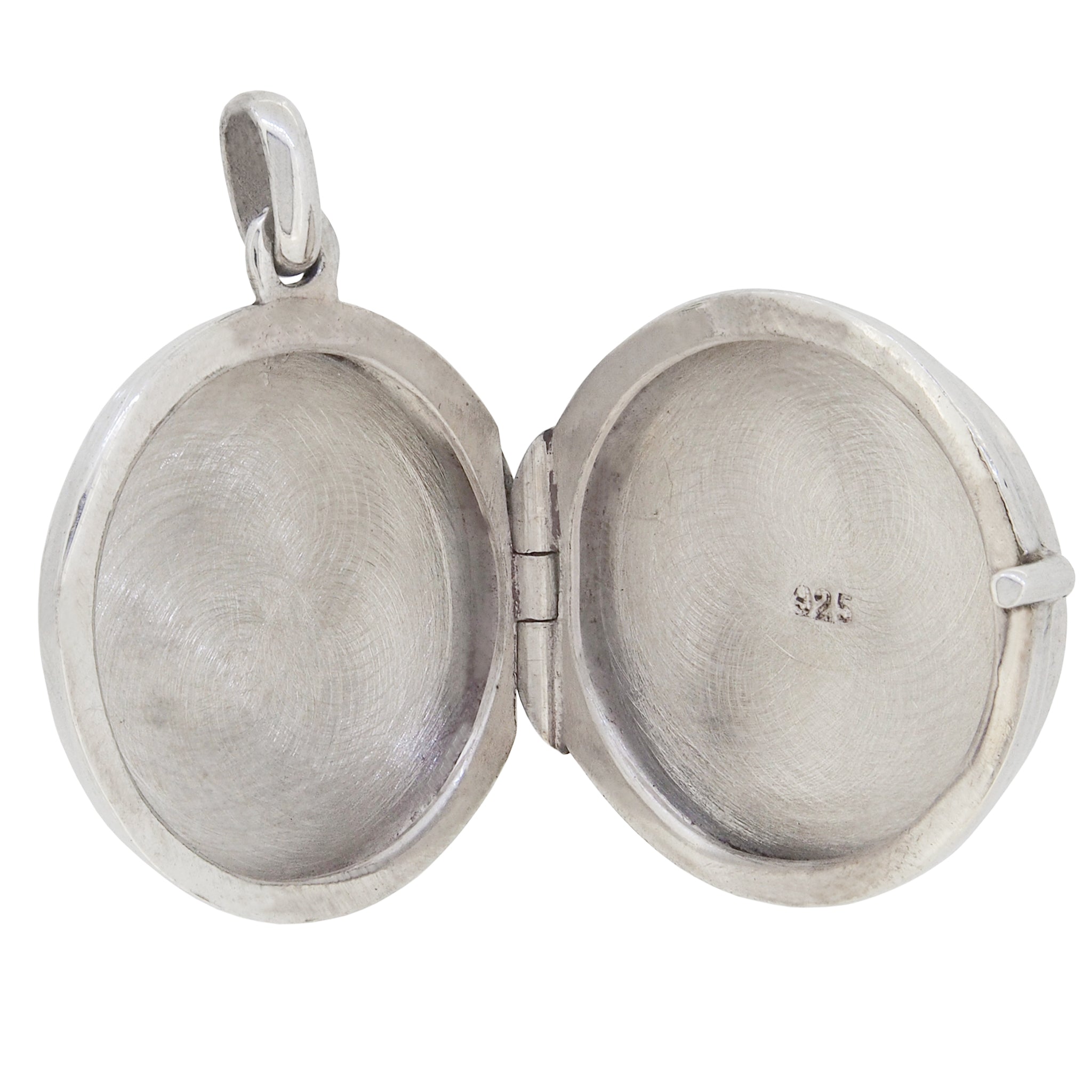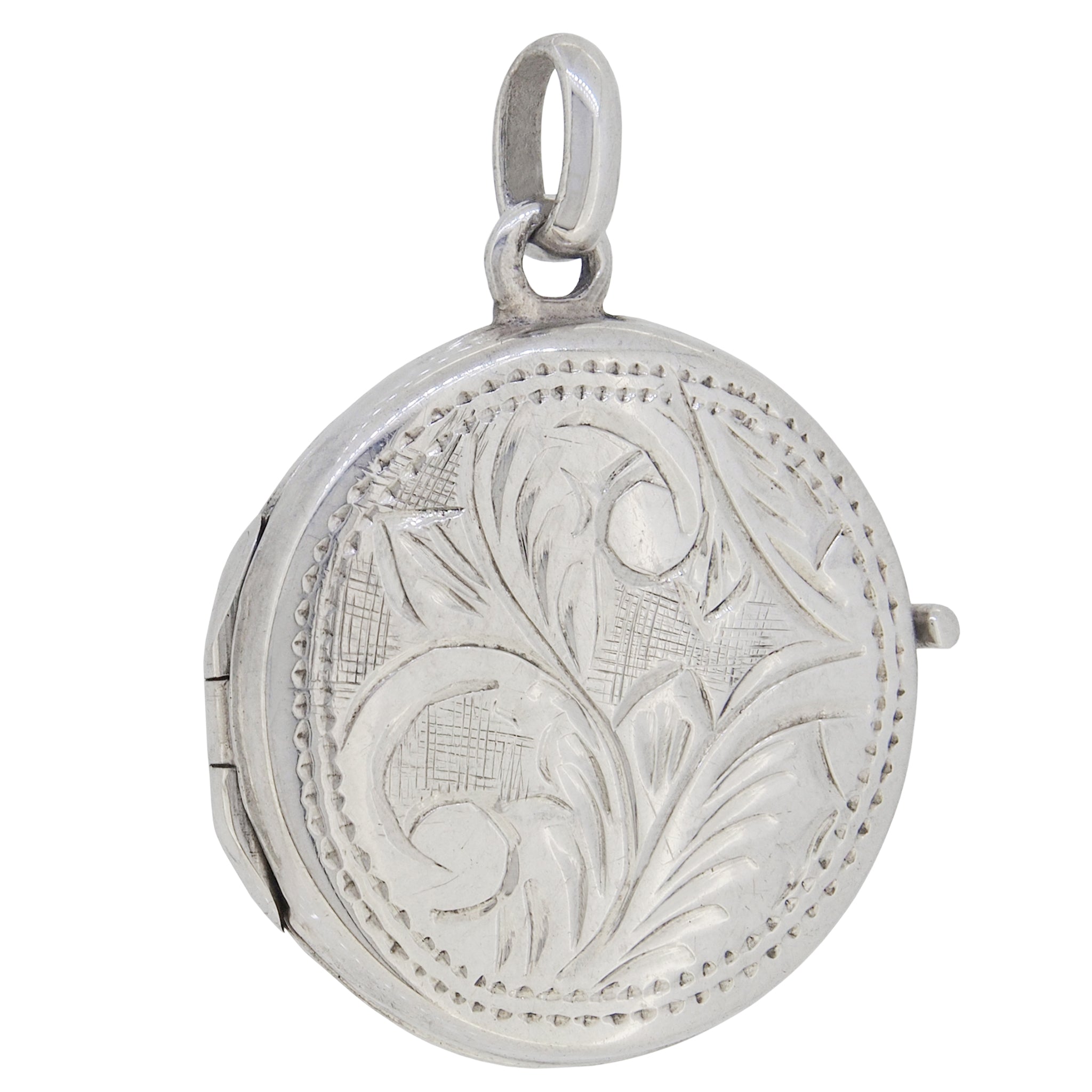 A modern, silver, abalone set circular locket.