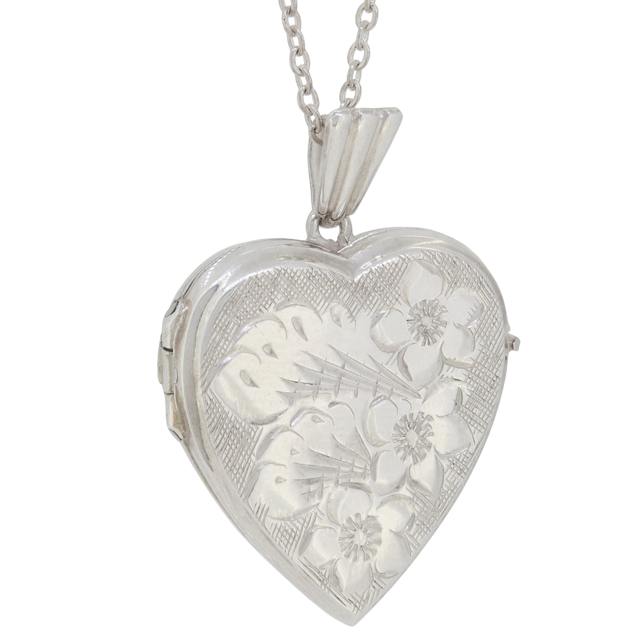 A mid-20th century, silver, engraved, heart shaped locket & chain.