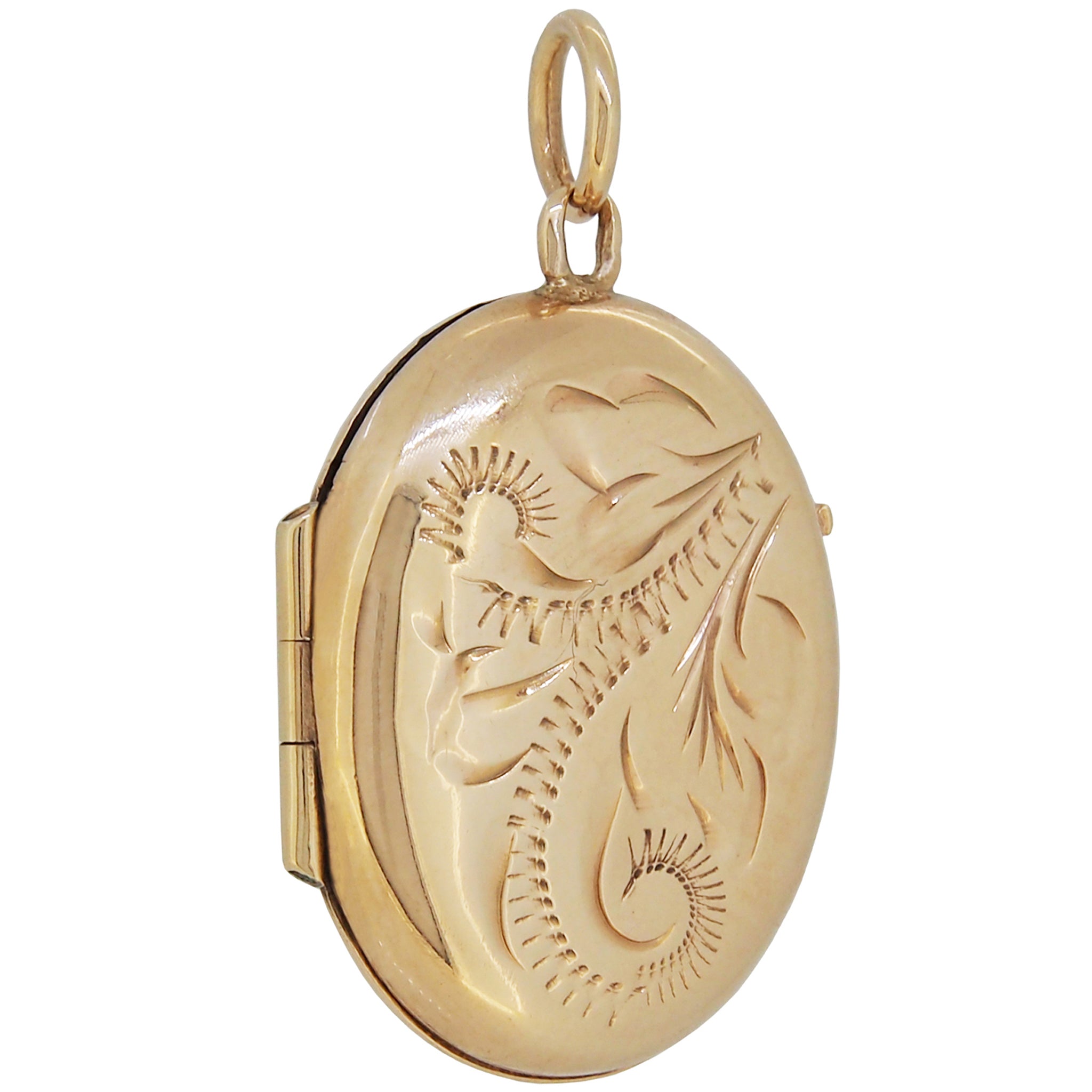 A mid-20th century, 9ct yellow gold, fully engraved oval locket.