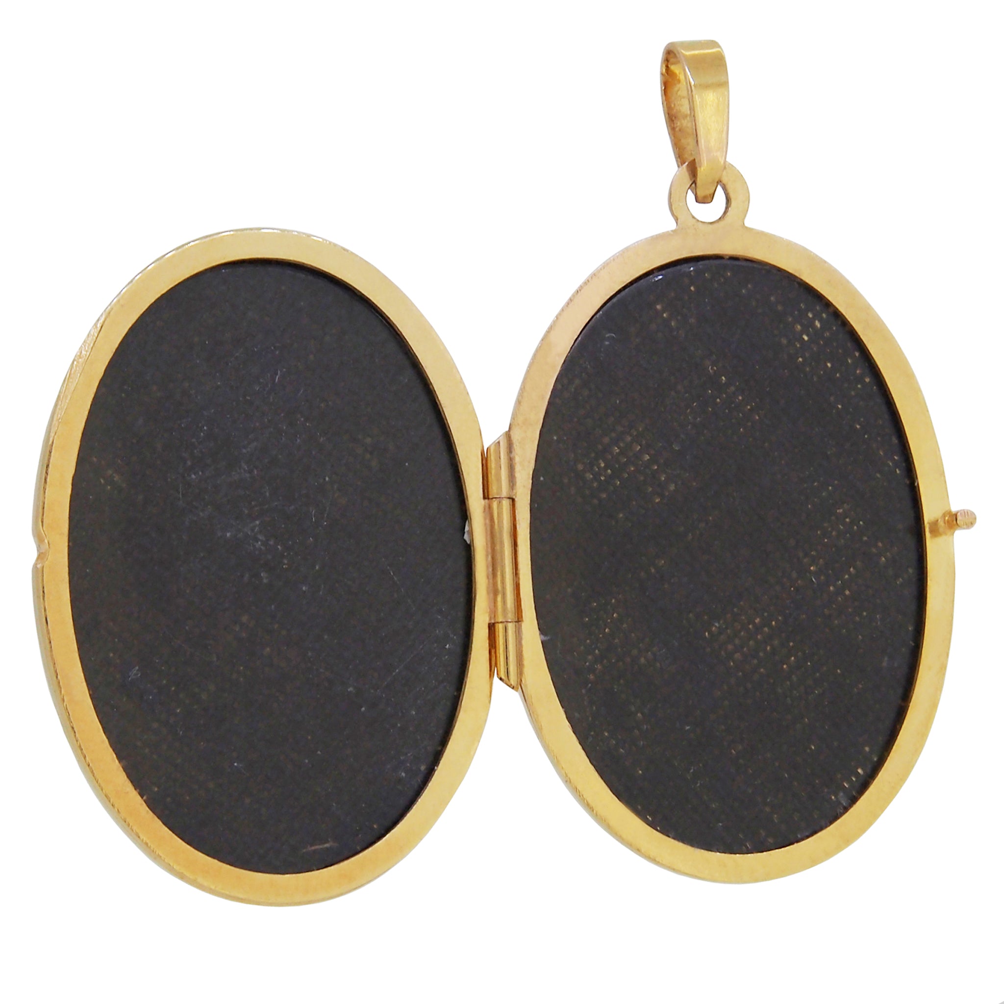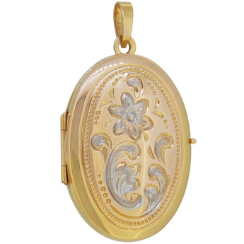 A modern, 9ct yellow gold, oval locket with a floral design.