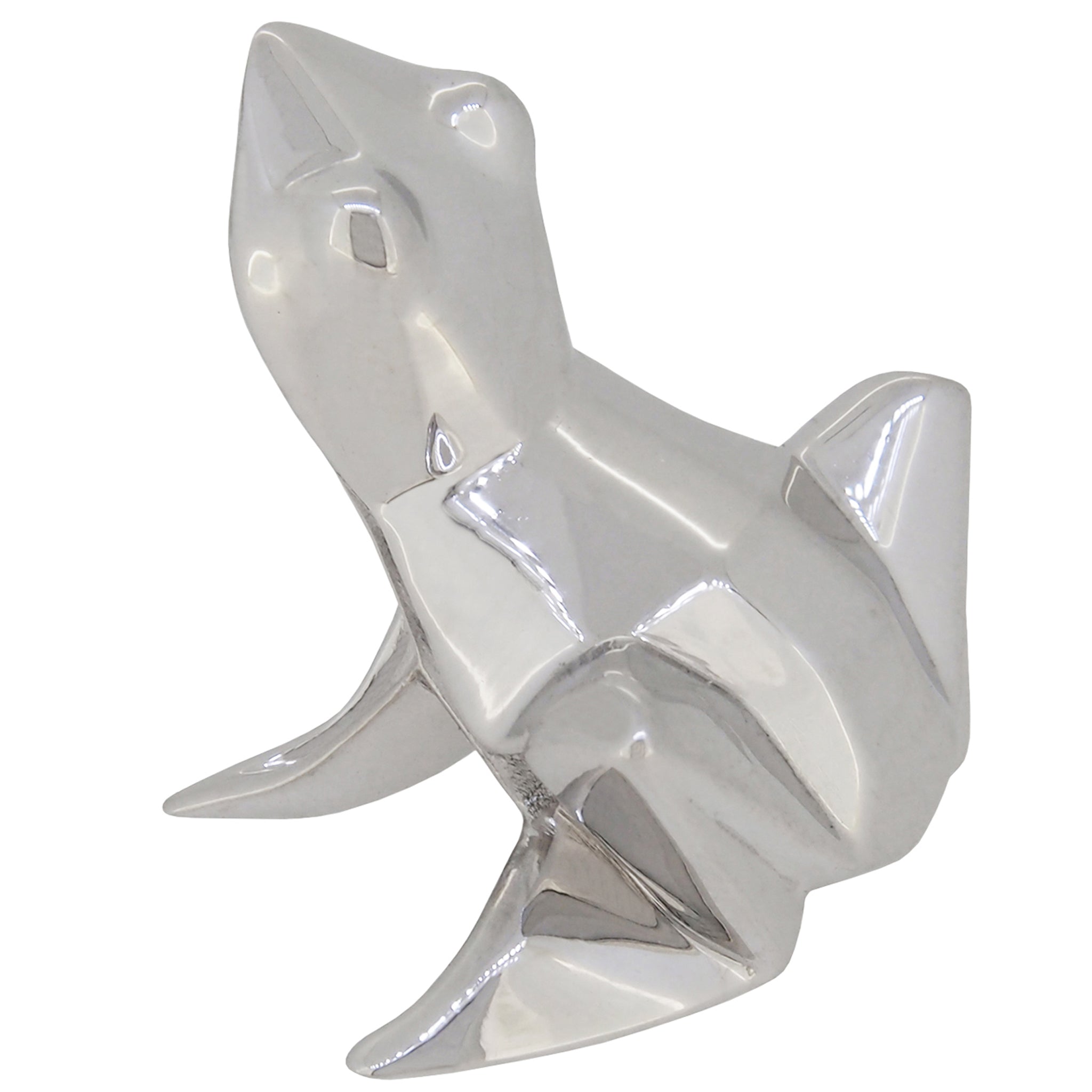 A modern, silver, origami style model of a frog.