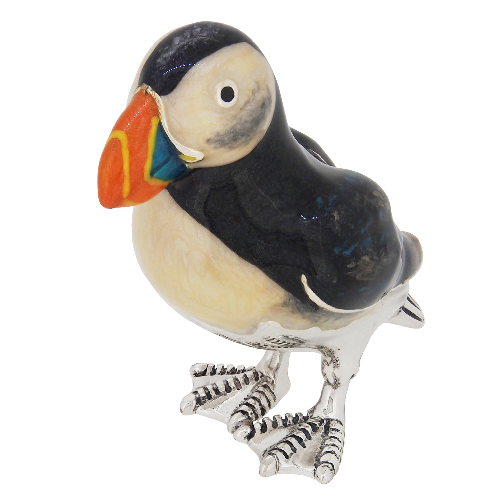 A modern, silver, enamel set model of a puffin.