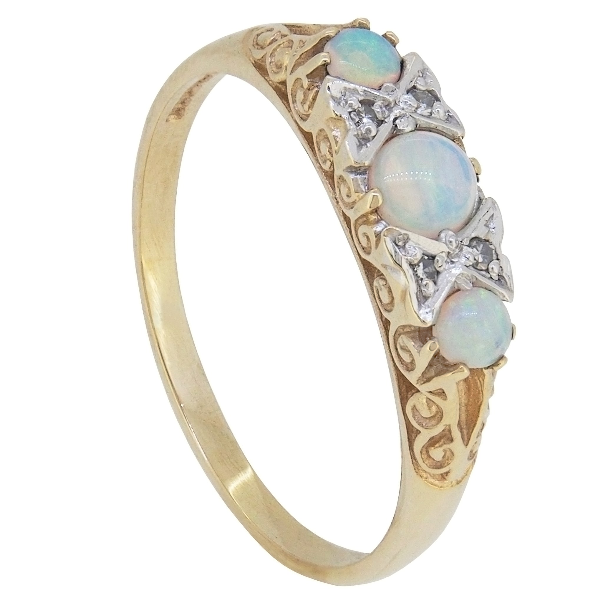 A modern, 9ct yellow gold, opal & diamond set carved half hoop ring.