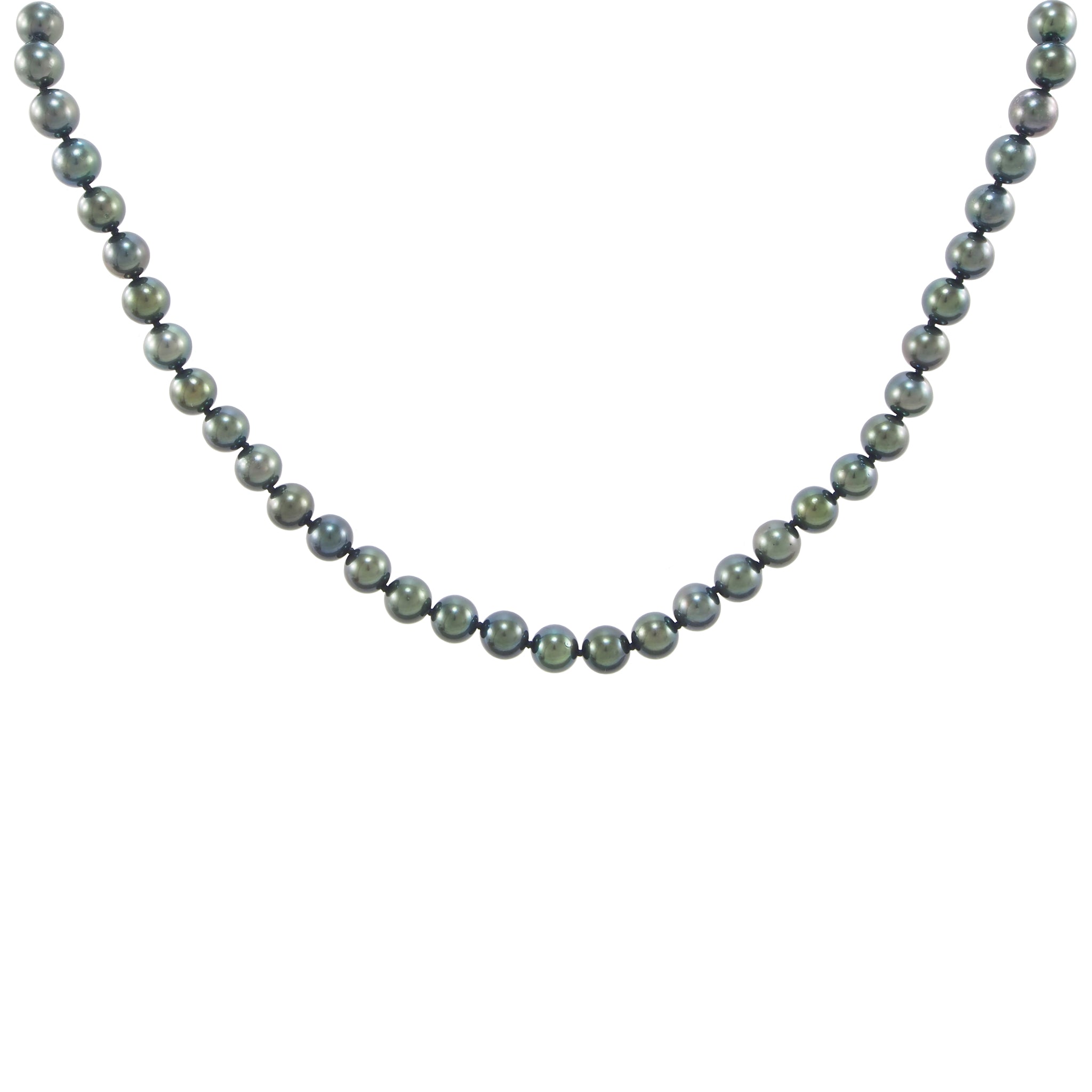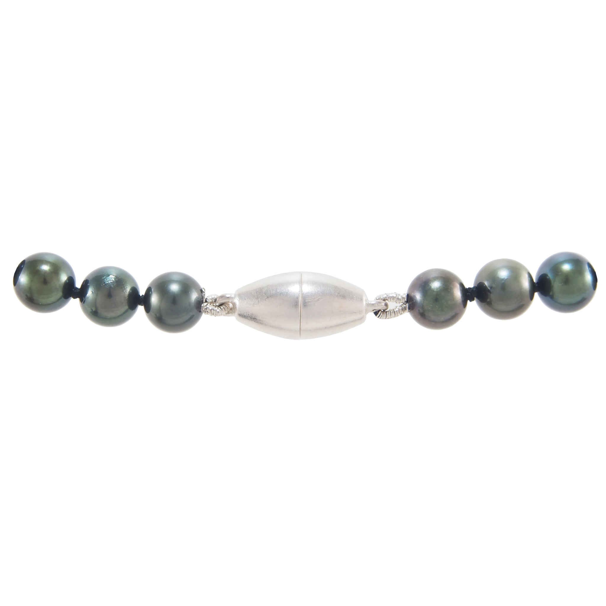 A modern, single row of black cultured pearls on a silver magnetic snap.