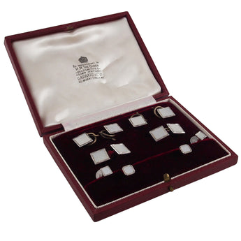 A mid-20th century, 9ct white gold, mother of pearl set dress set & fitted case.