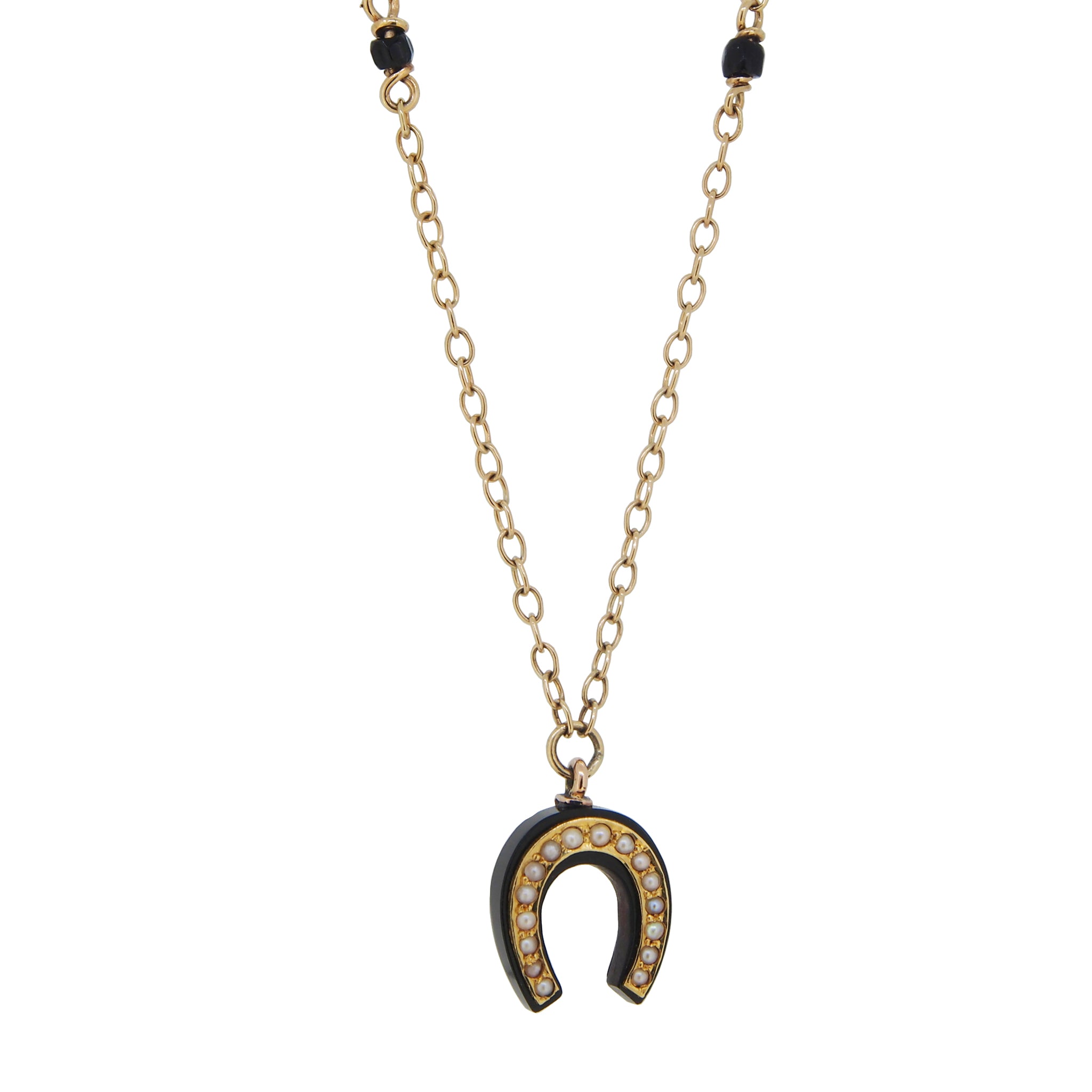 A yellow gold, black onyx & seed pearl set horseshoe necklace.