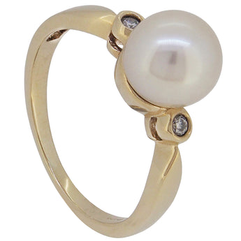 A modern, yellow gold, pearl & diamond set three stone ring.