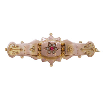 A Victorian, 9ct yellow gold, pearl & red gem set brooch.
