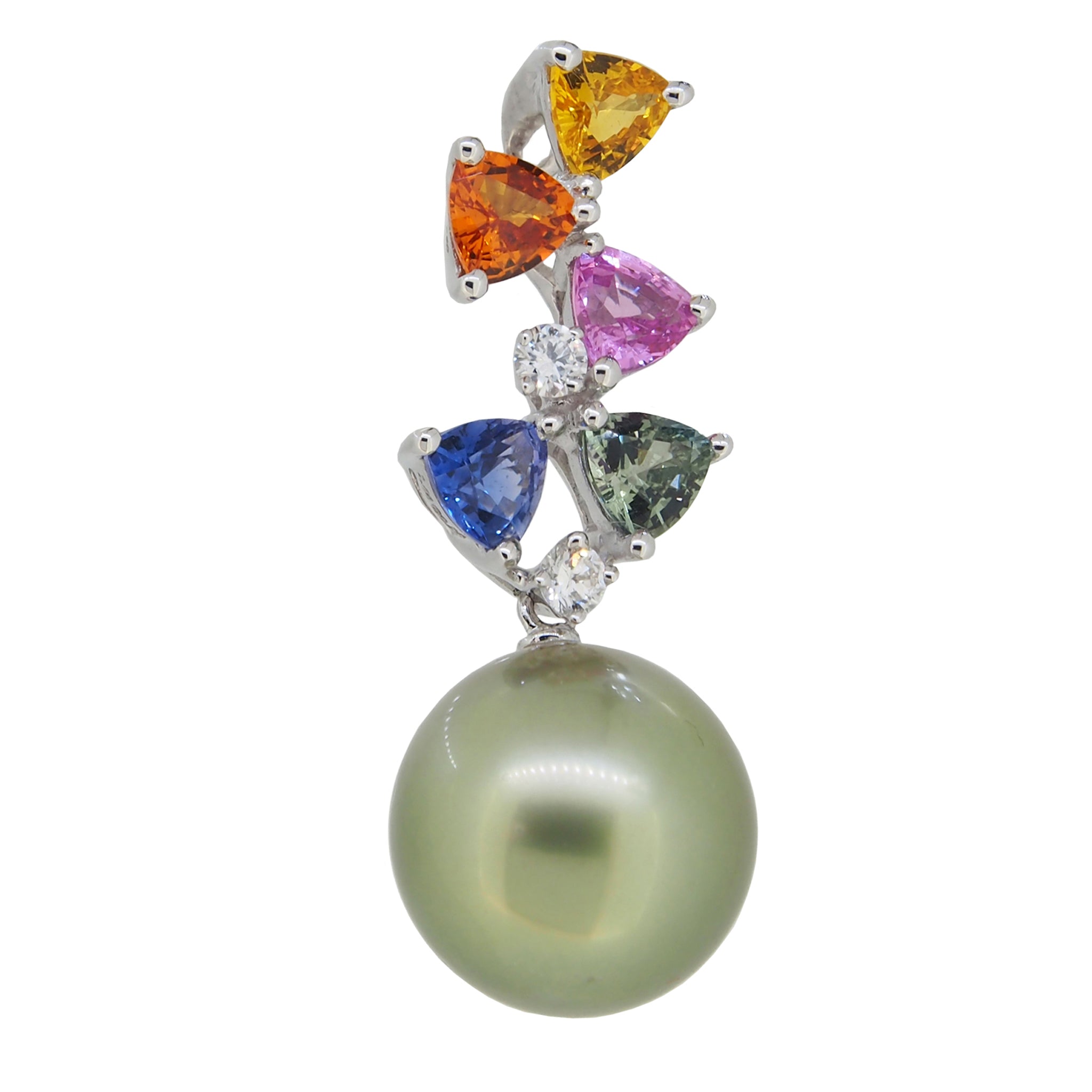 A modern, 18ct white gold, Tahitian pearl & multi coloured sapphire set pendant & chain.