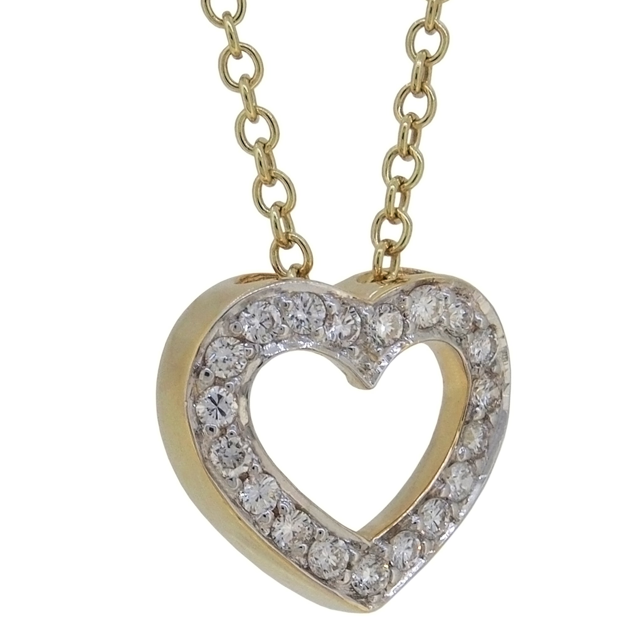 A modern, 18ct yellow gold, diamond set, nineteen stone, open work, heart shaped pendant & chain.