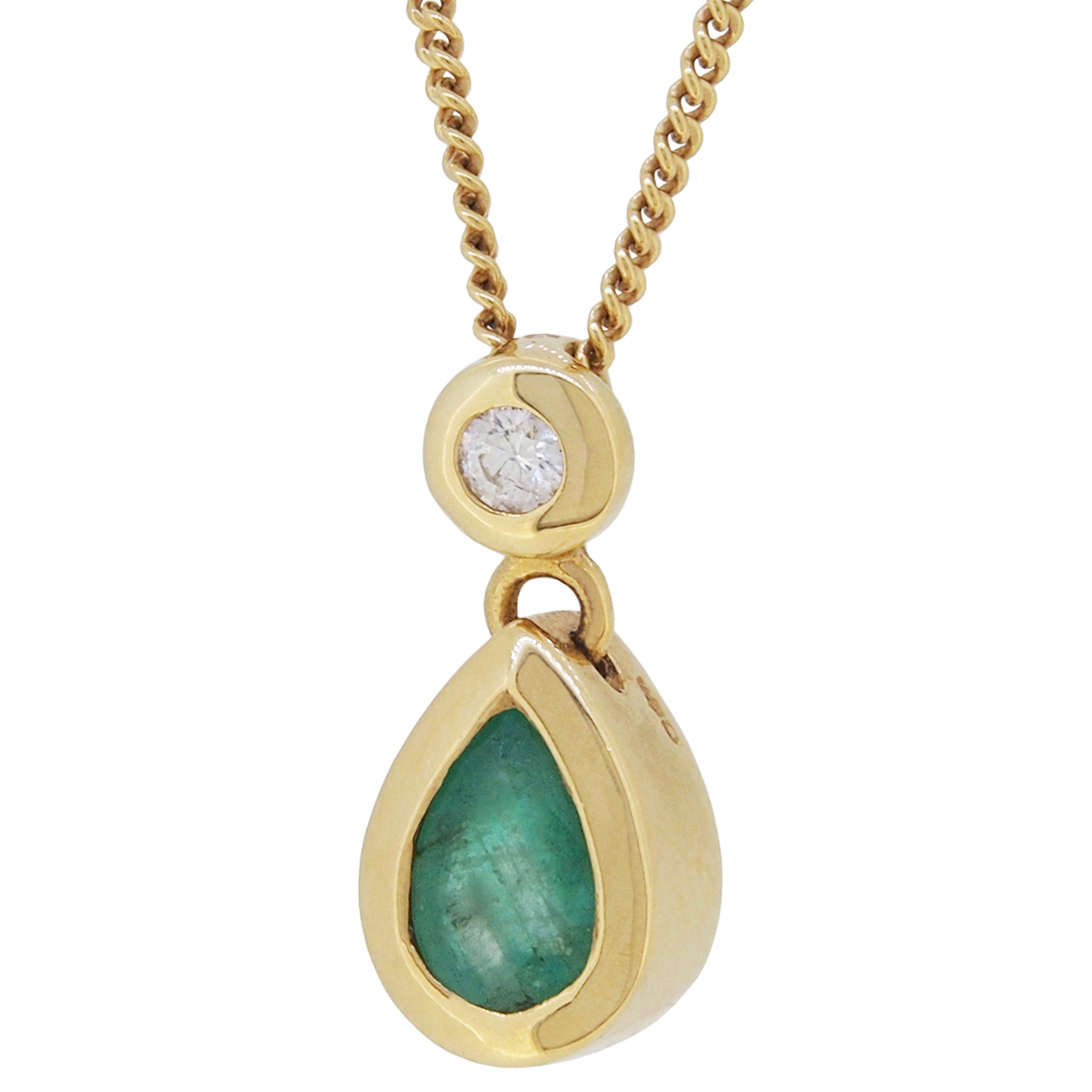 A modern, 18ct yellow gold, emerald & diamond set pendant & chain.