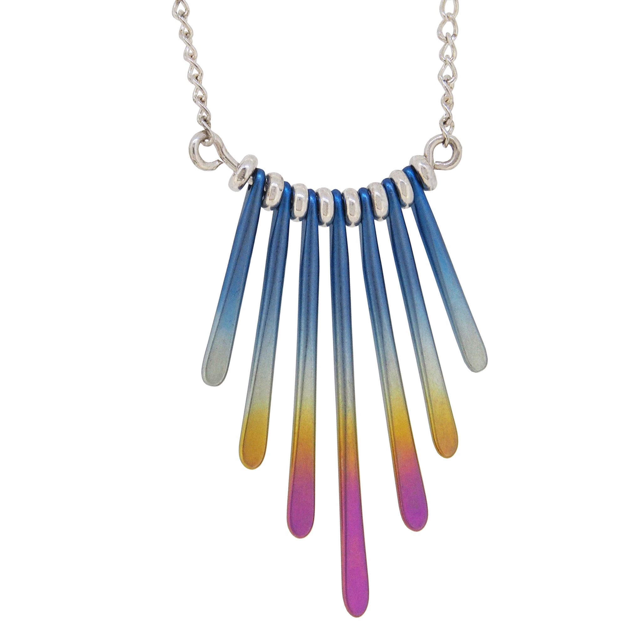 A modern, silver & titanium, multicoloured, abstract fringe necklace.