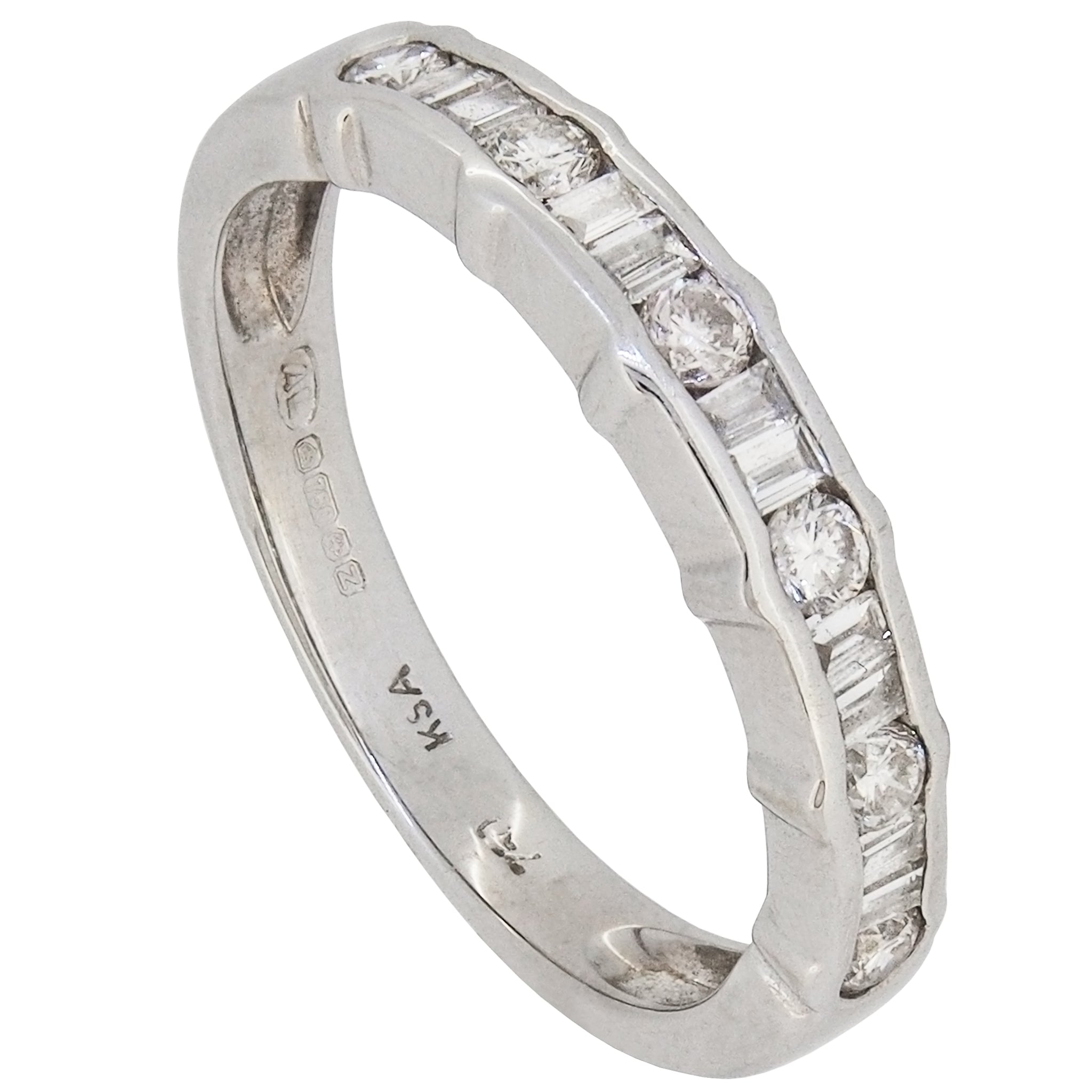 A modern, 18ct white gold, brilliant & baguette cut diamond set half eternity ring.