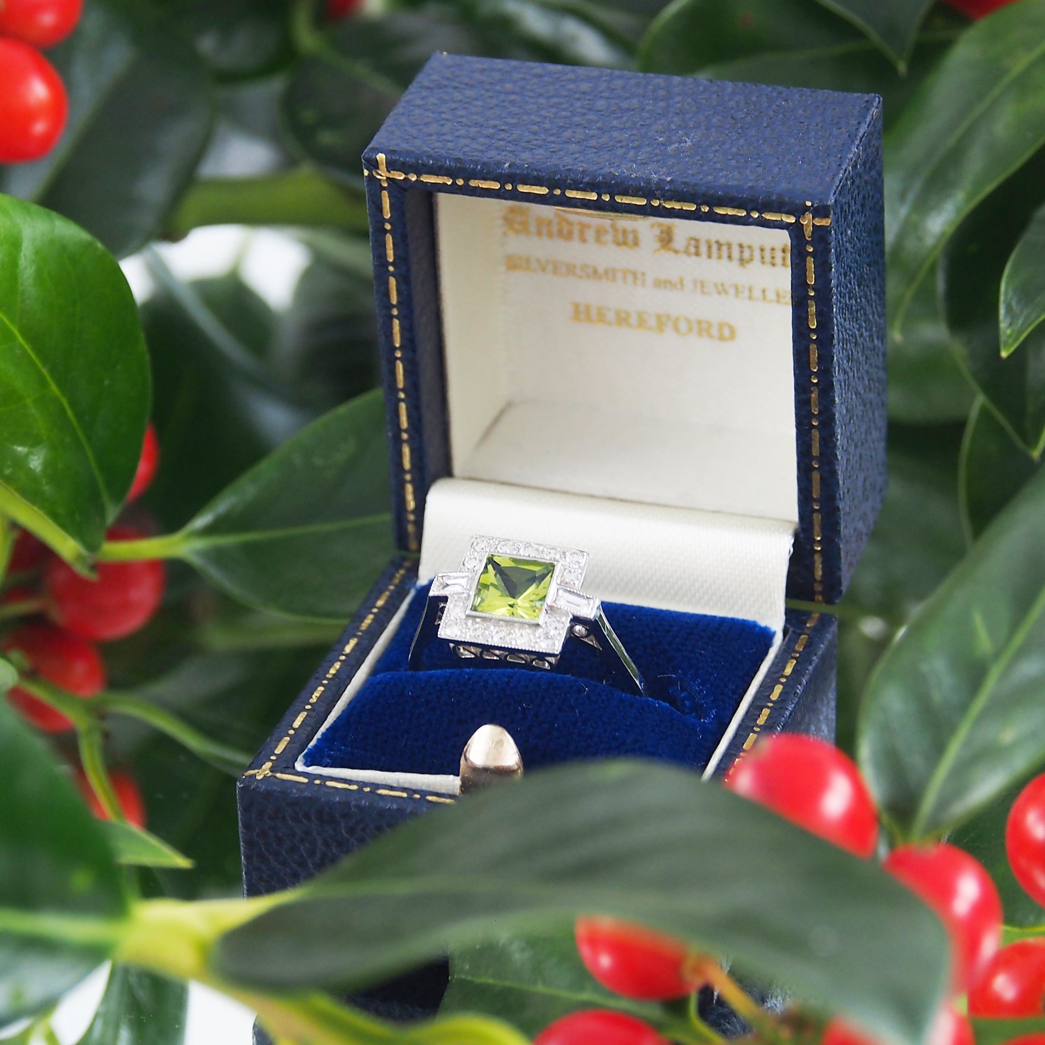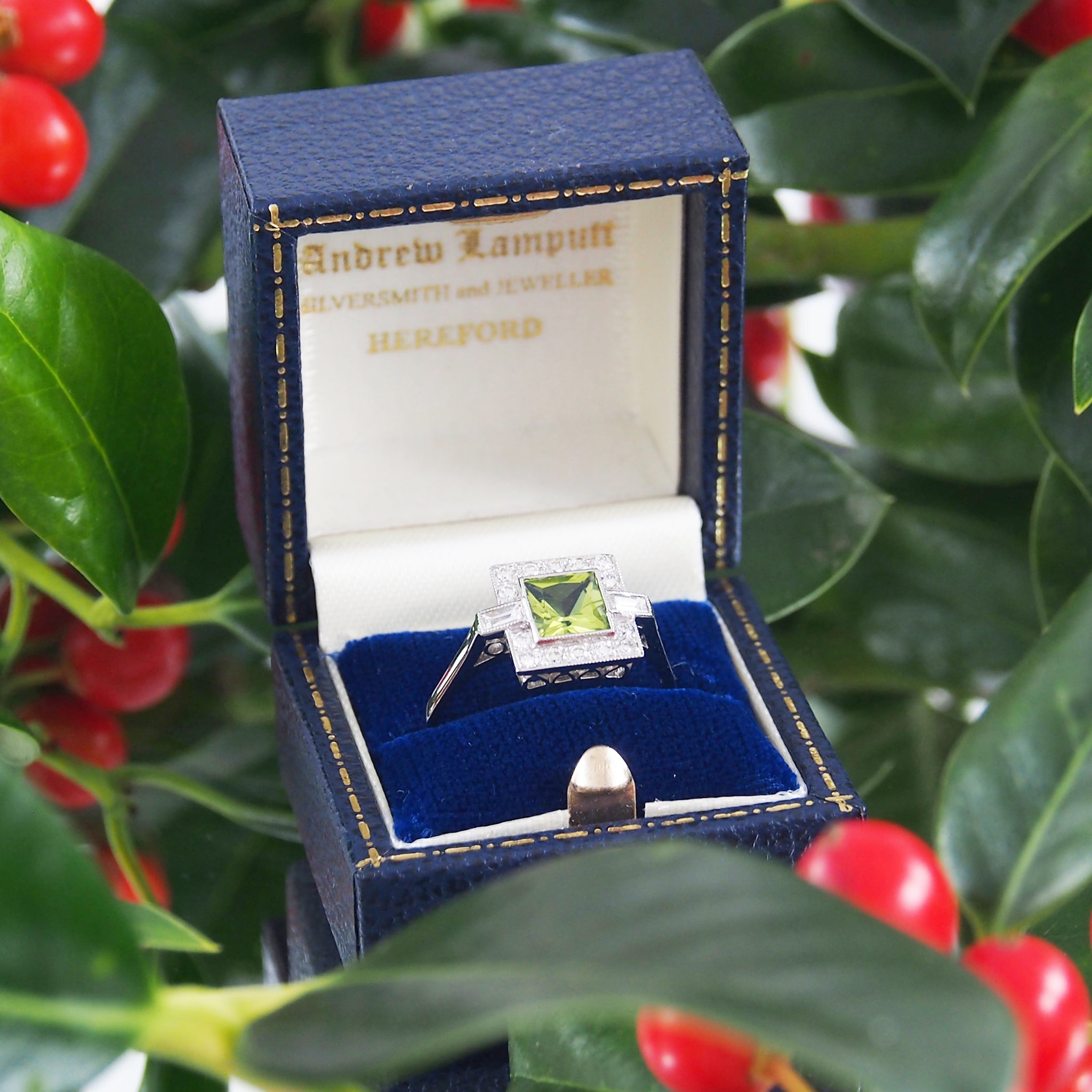 A modern, platinum, peridot & diamond set, square, Art Deco style cluster ring.
