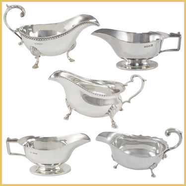 Whether for the dining table or as a decorative addition, our Sauce Boats & Gravy Boats collection includes Antique, Traditional, Vintage & Modern pieces. These silver treasures combine function & form with graceful design.