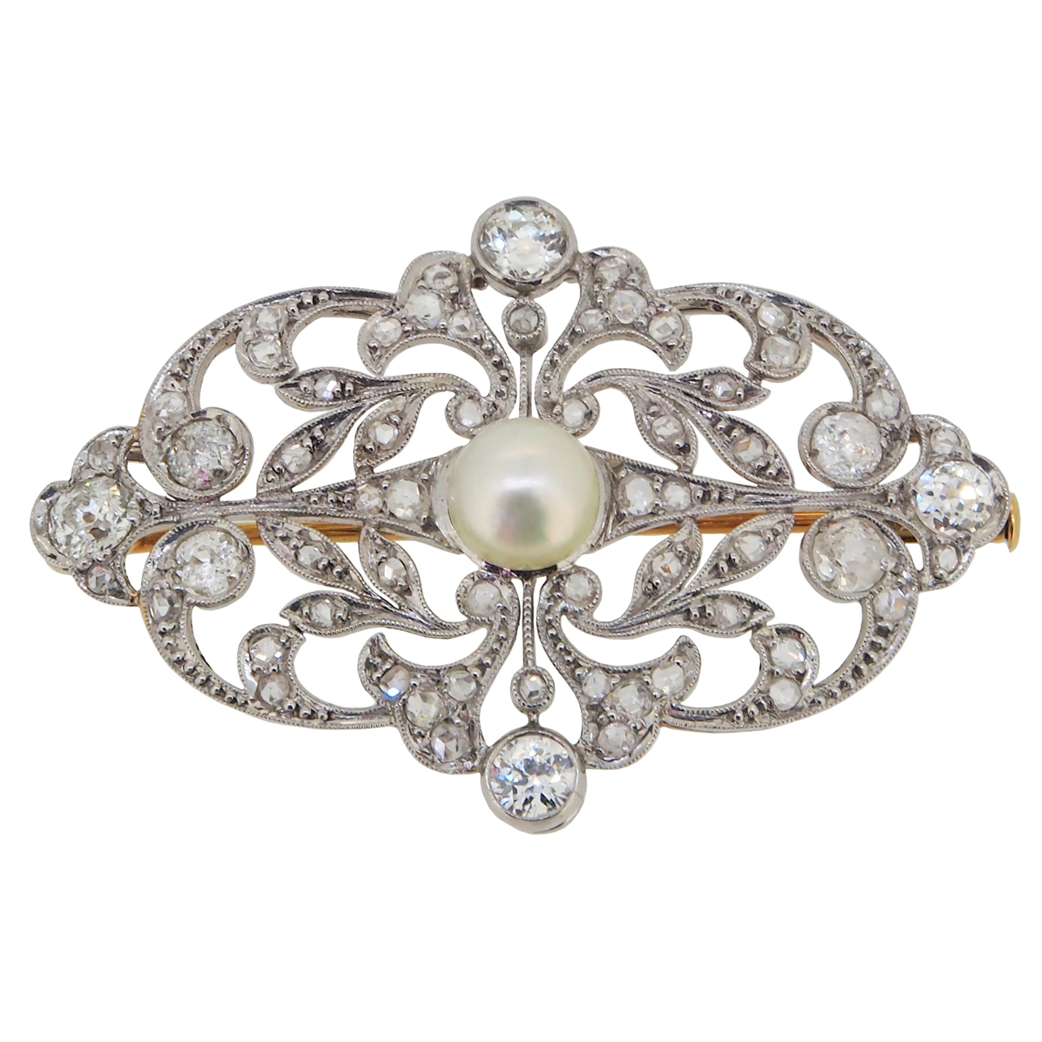 A platinum, diamond & pearl set, open work brooch with a yellow gold pin.