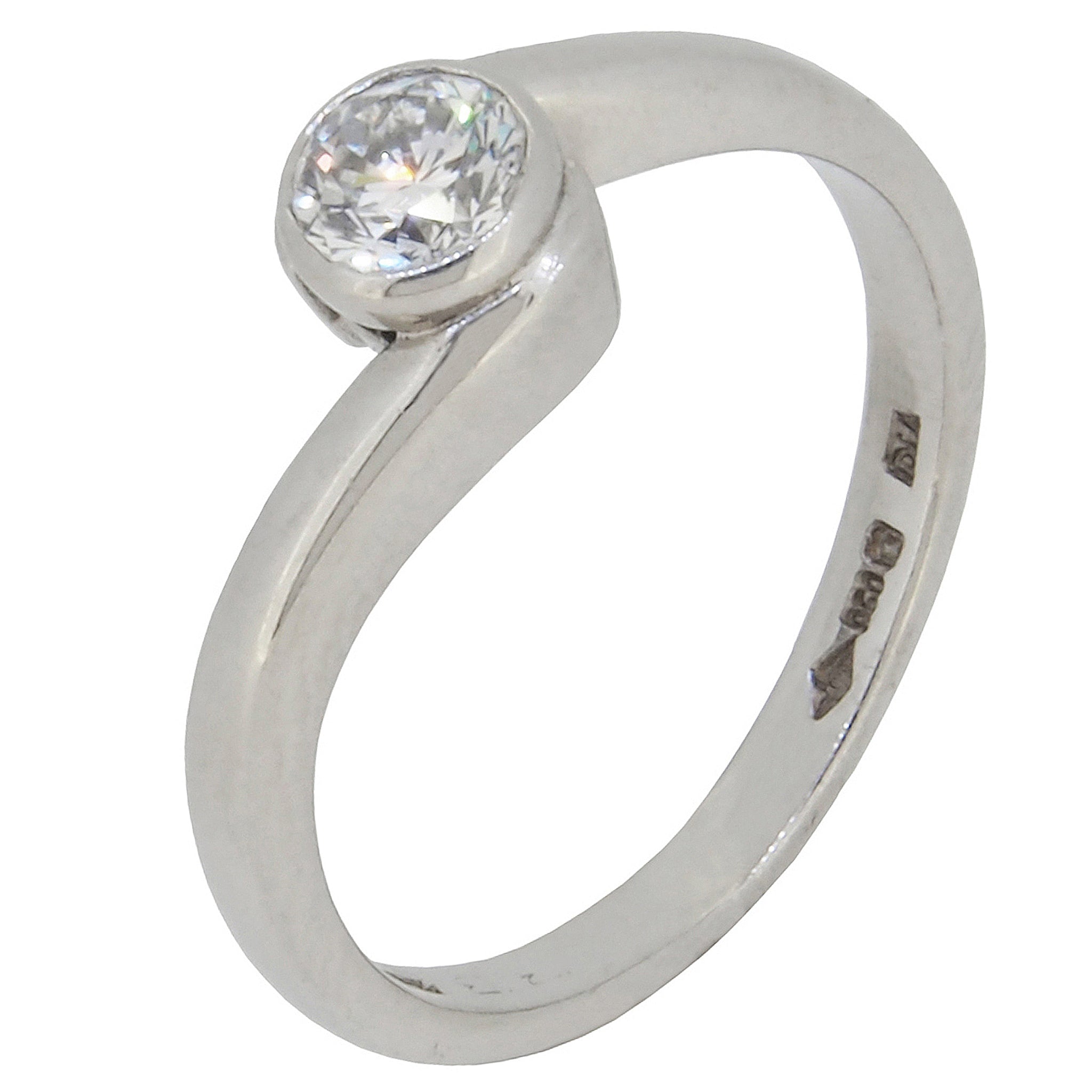 A modern, platinum, diamond set, single stone, solitaire crossover ring.