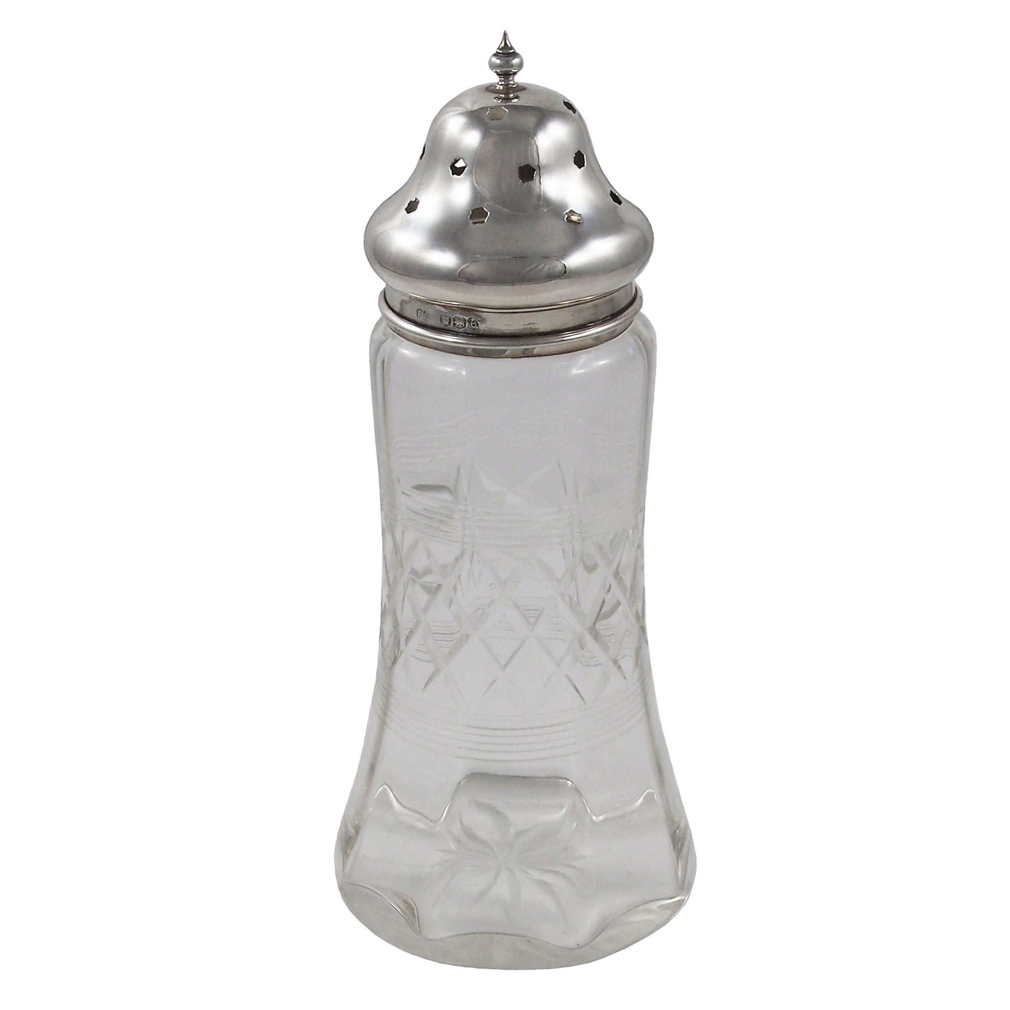 An early 20th century, glass sugar dredger with a silver lid.