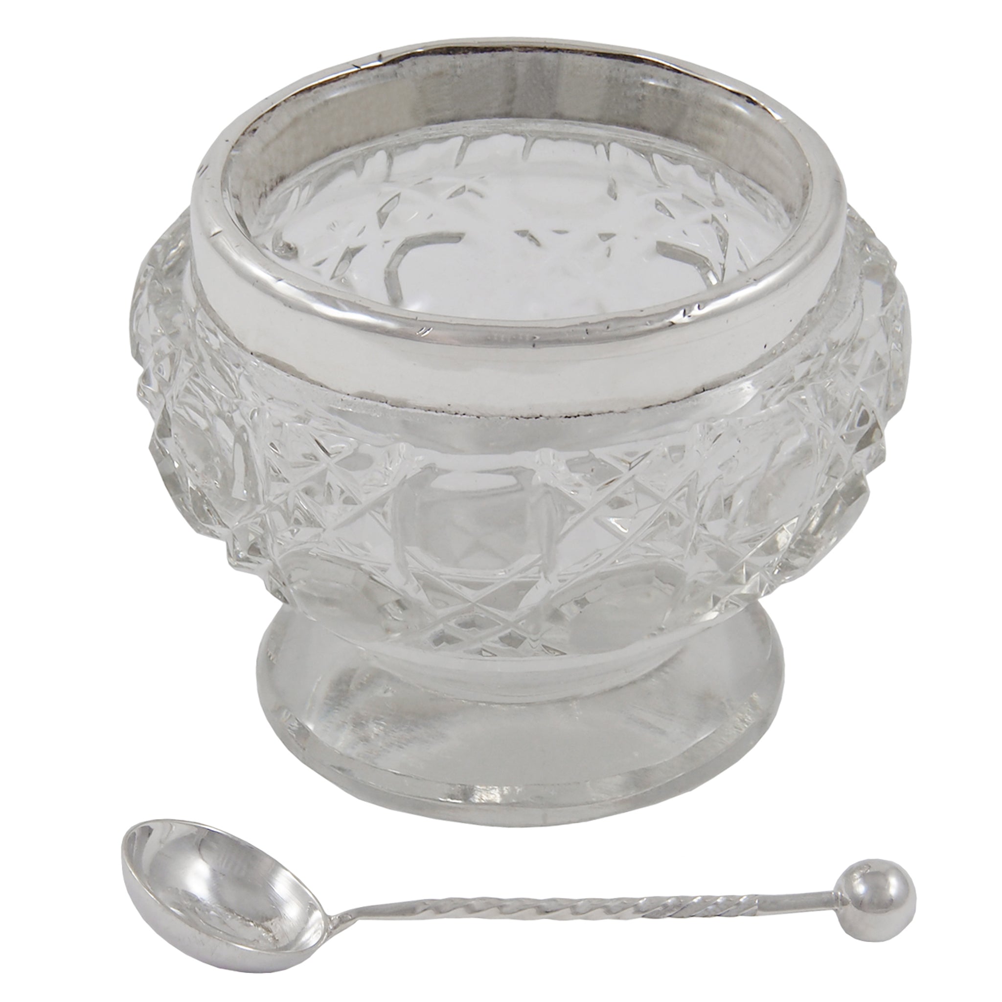 An Edwardian, cut glass open salt with a silver rim & spoon.