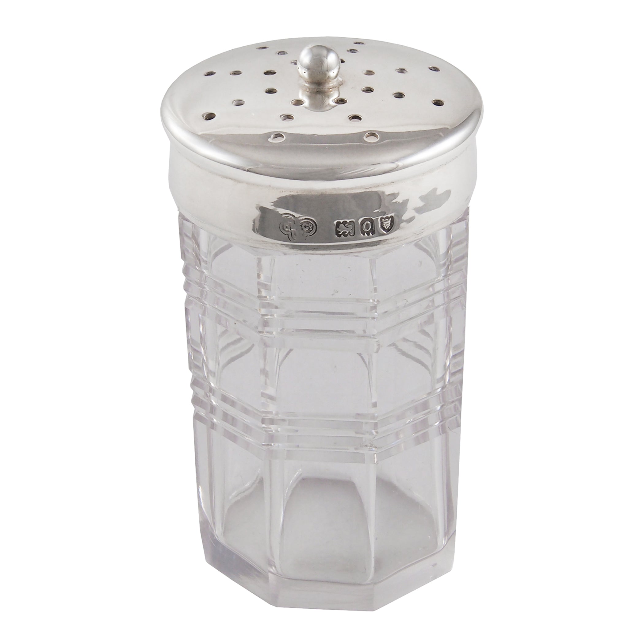 An Edwardian, glass, hexagonal pepper pot with a silver top.