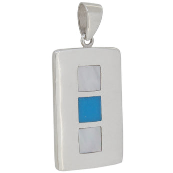 A modern, silver, mother of pearl & turquoise set rectangular pendant.