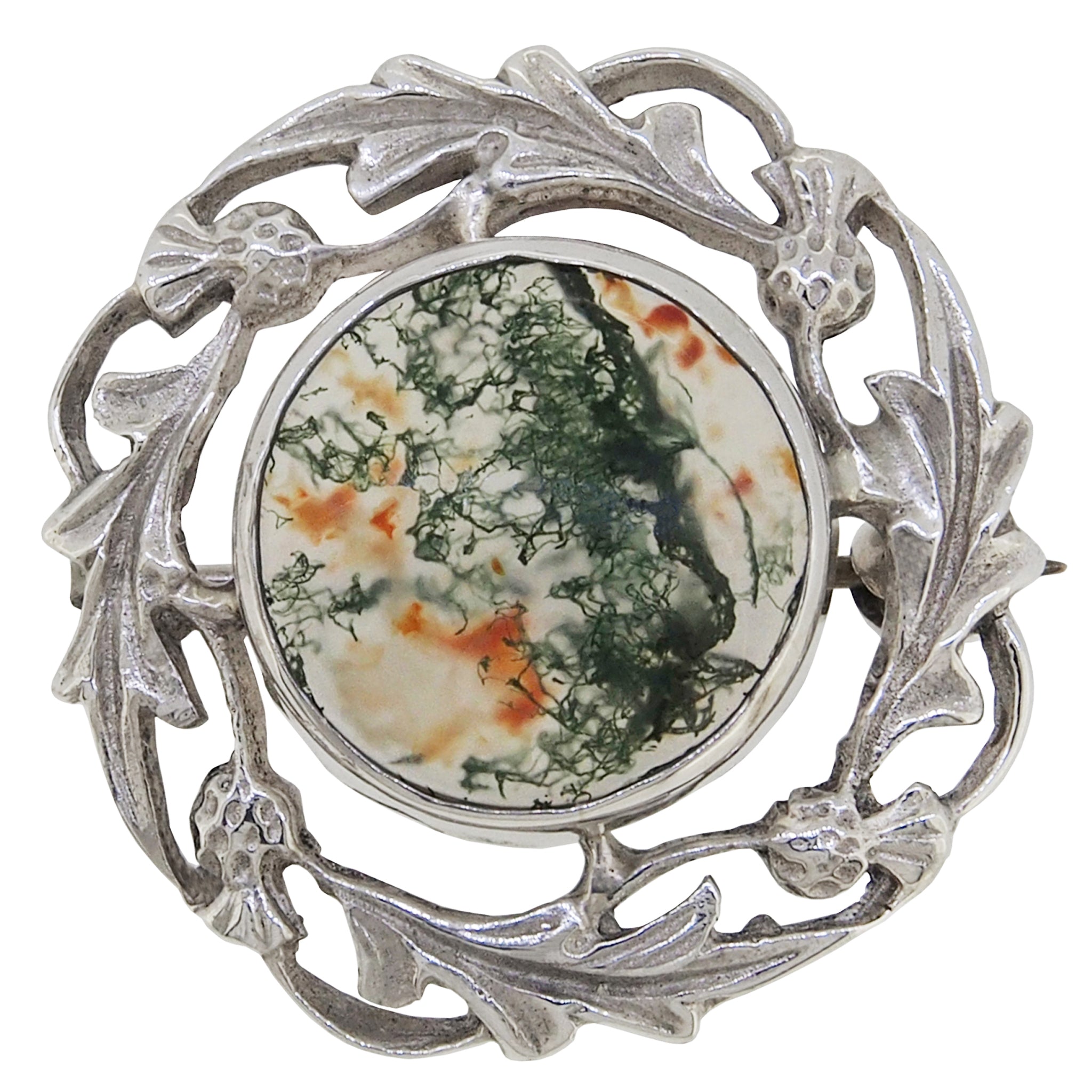 A mid-20th century, silver, moss agate set brooch with thistle designs.