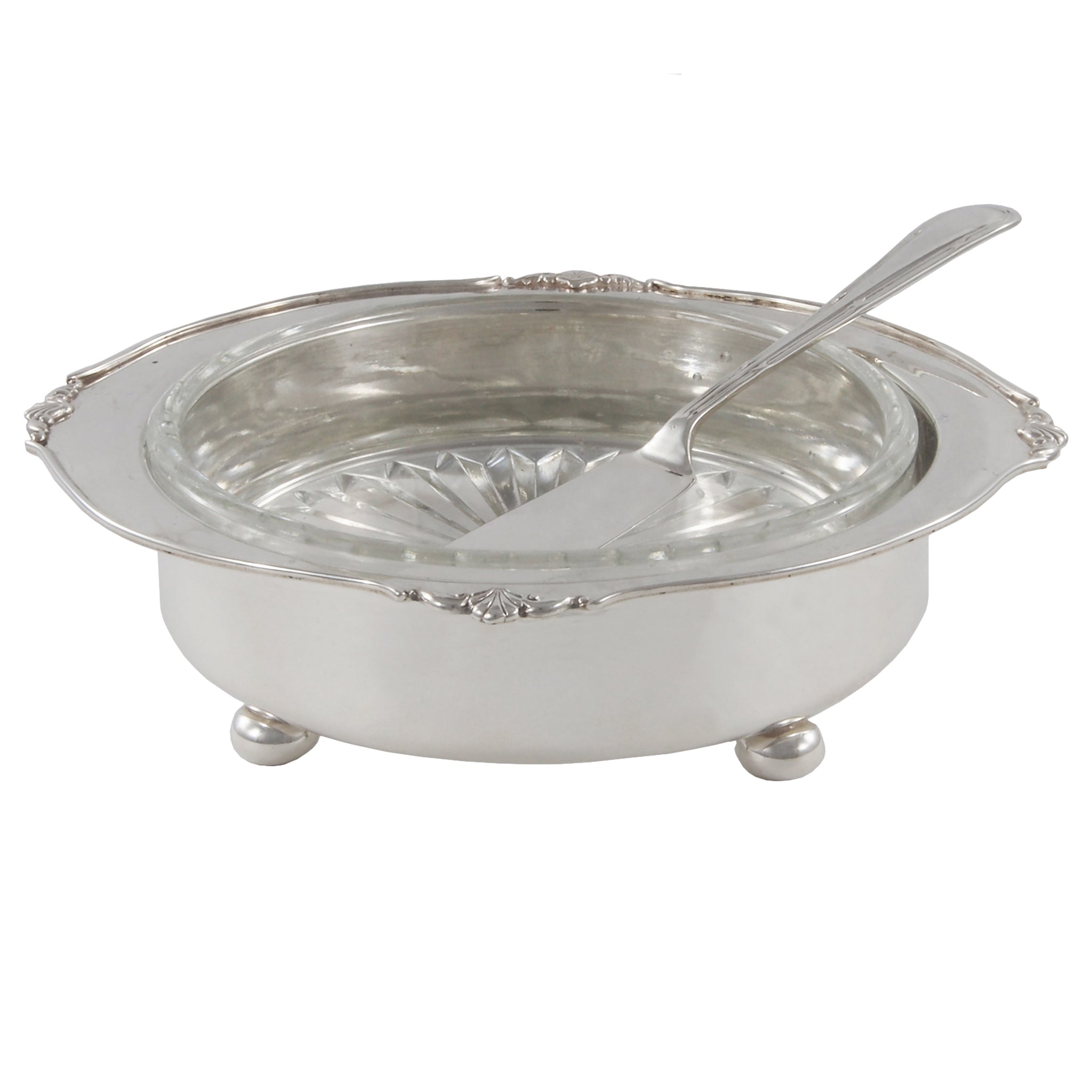 An Edwardian, silver, circulare butter dish on four ball feet, with a glass liner & butter knife.