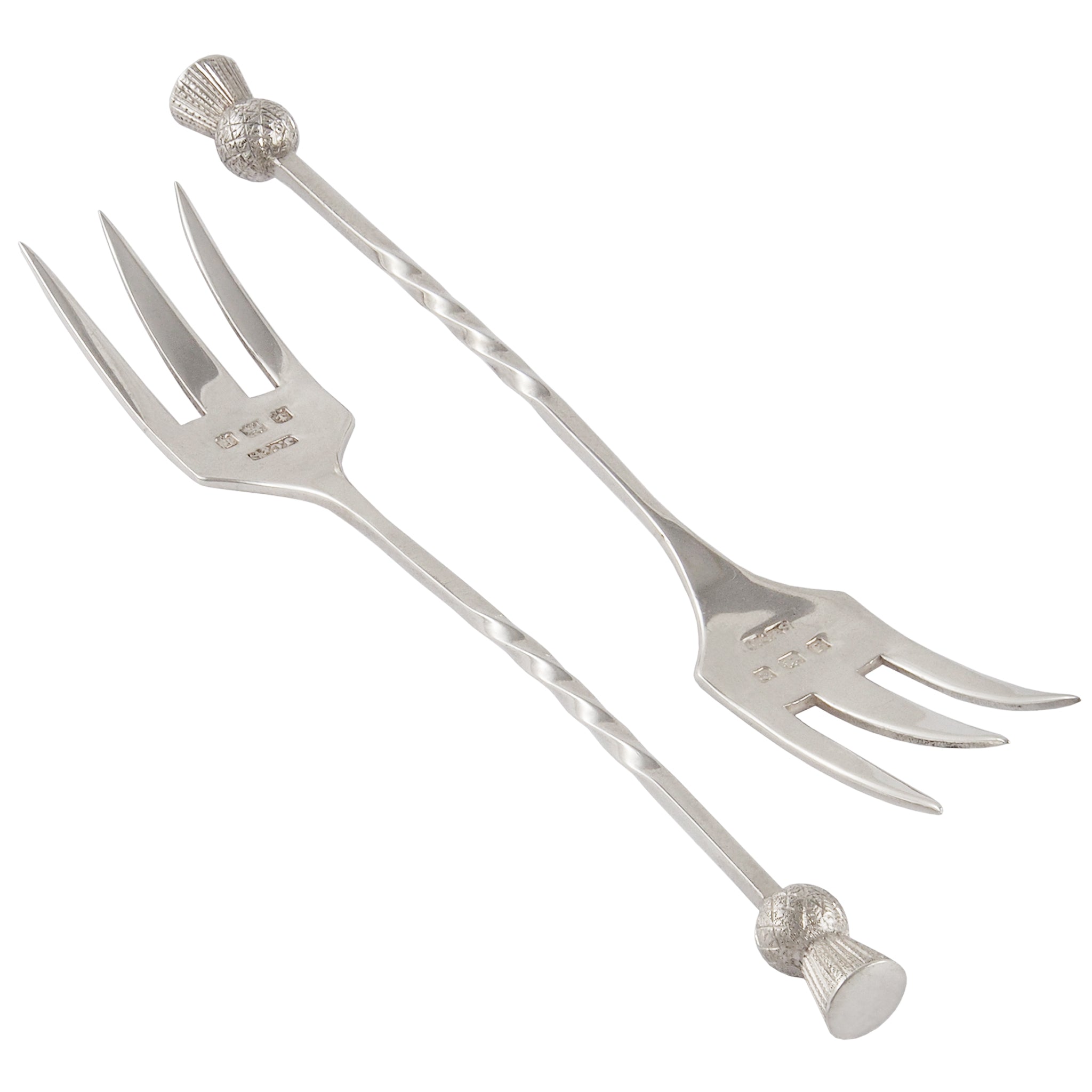 A pair of early 20th century, silver forks with thistle decorations on the terminal ends.