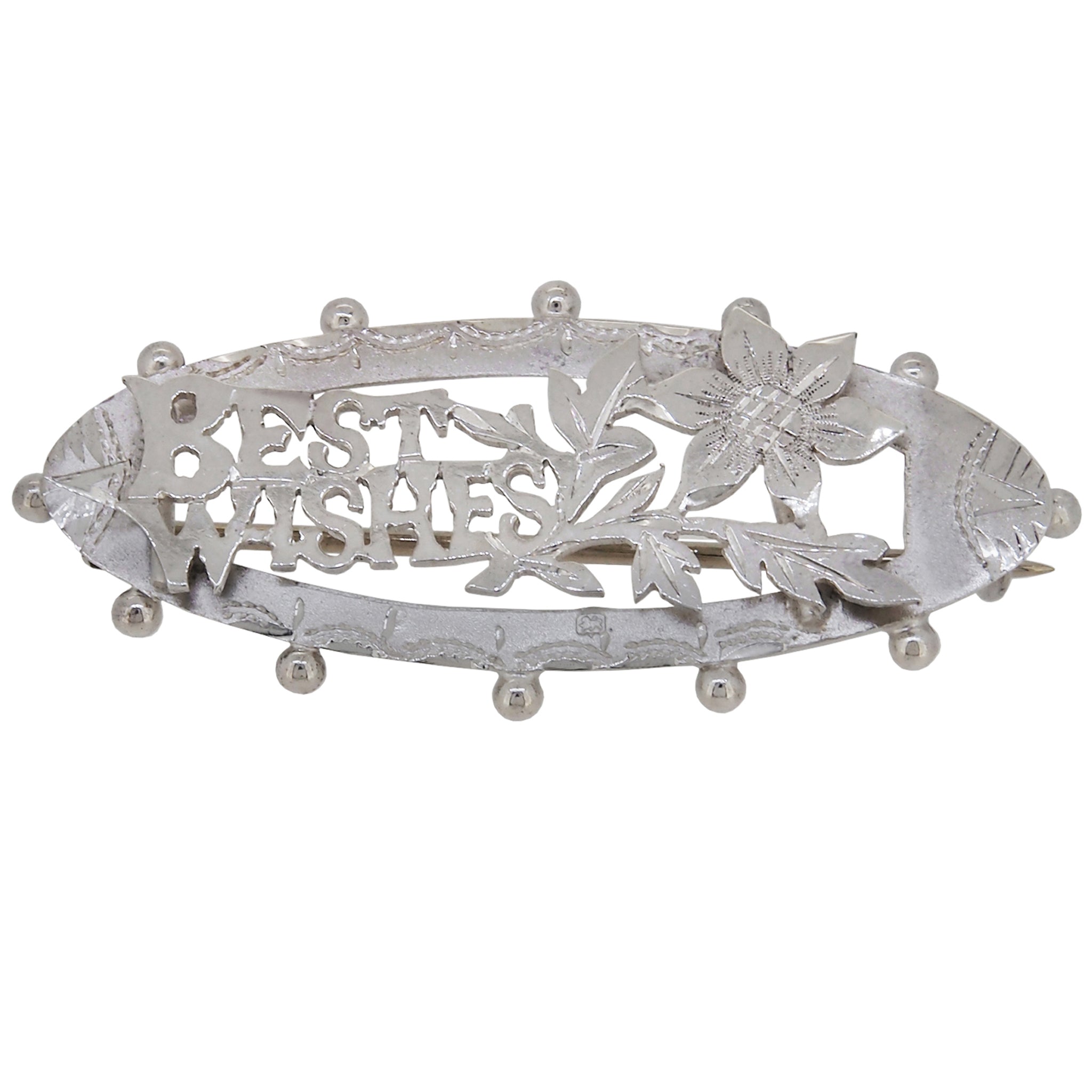 A Victorian, silver, brooch featuring the words 'Best Wishes' & a flower.