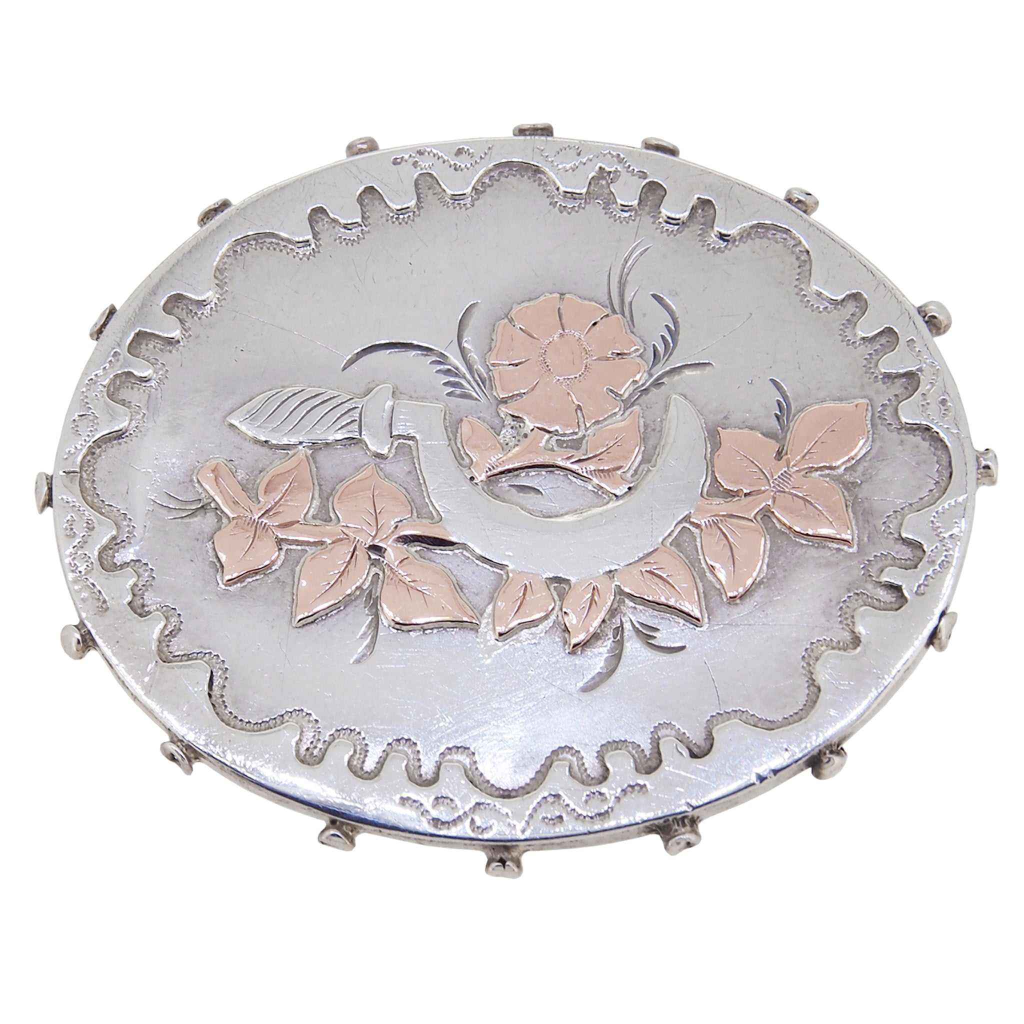 A Victorian, silver & applied gold, flower & sickle oval brooch.