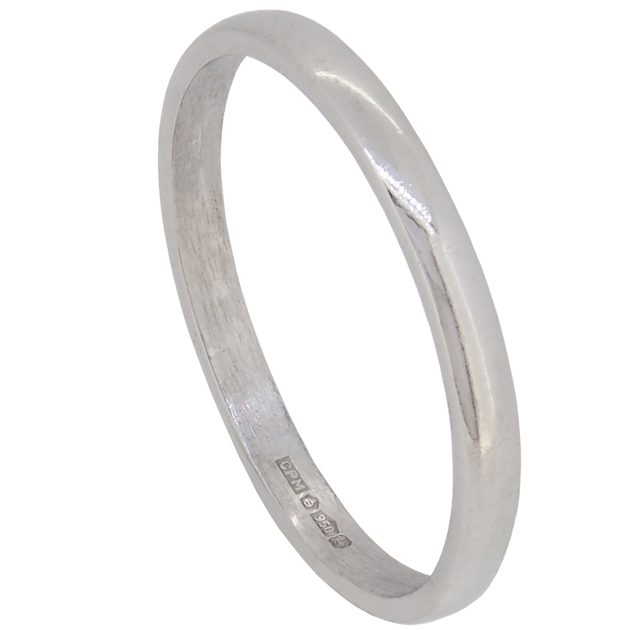 A modern, platinum, D shaped wedding ring.