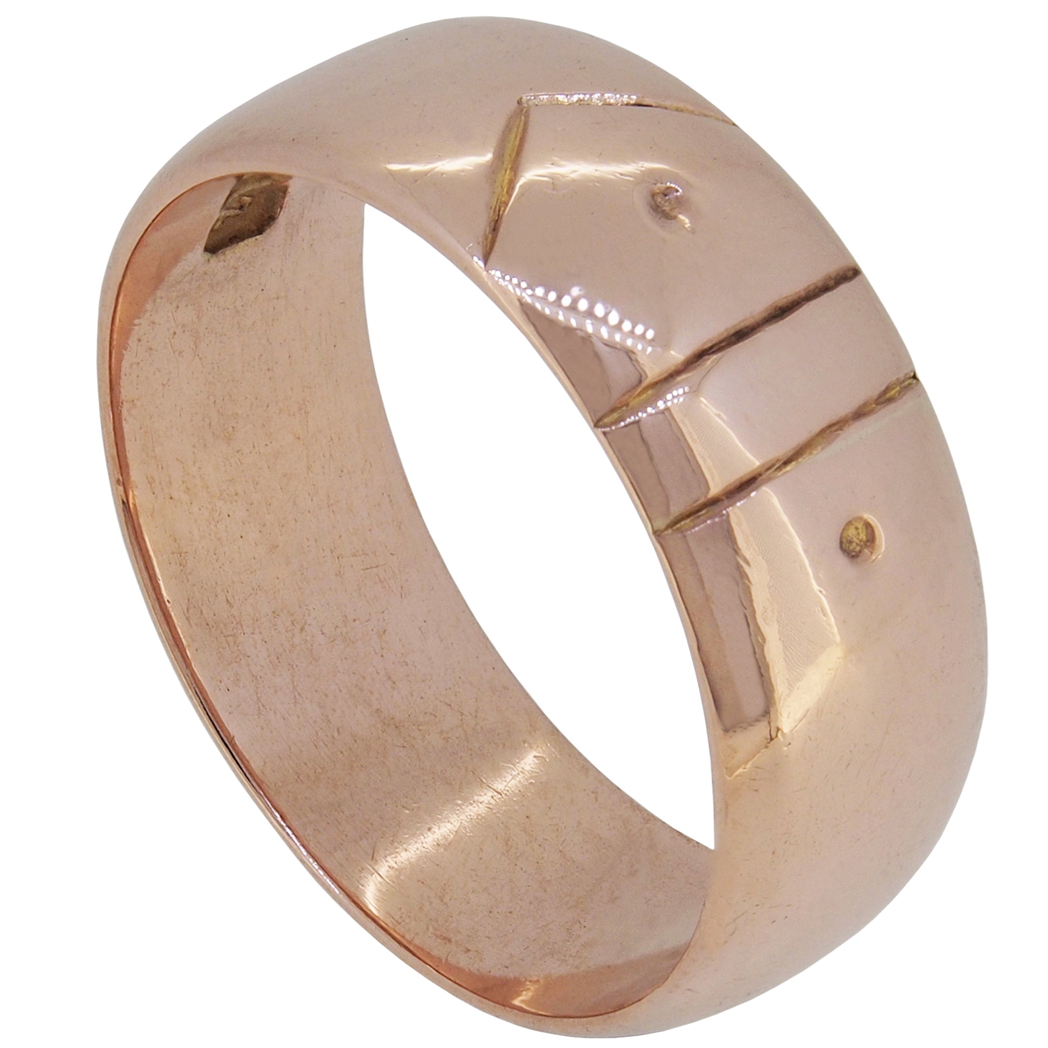 An early 20th century, 9ct rose gold, D shaped wedding ring with a buckle design engraving.