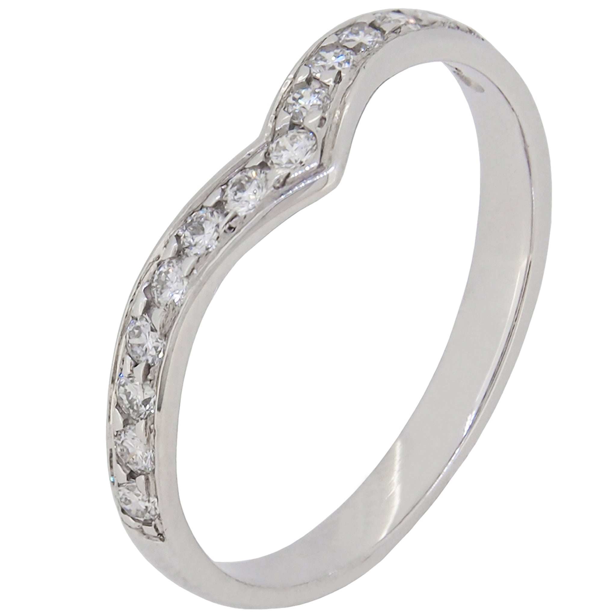 A modern, 18ct white gold, diamond set, shaped wedding ring.
