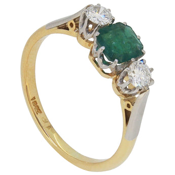 An early 20th century, 18ct yellow gold, emerald & diamond set three stone ring.